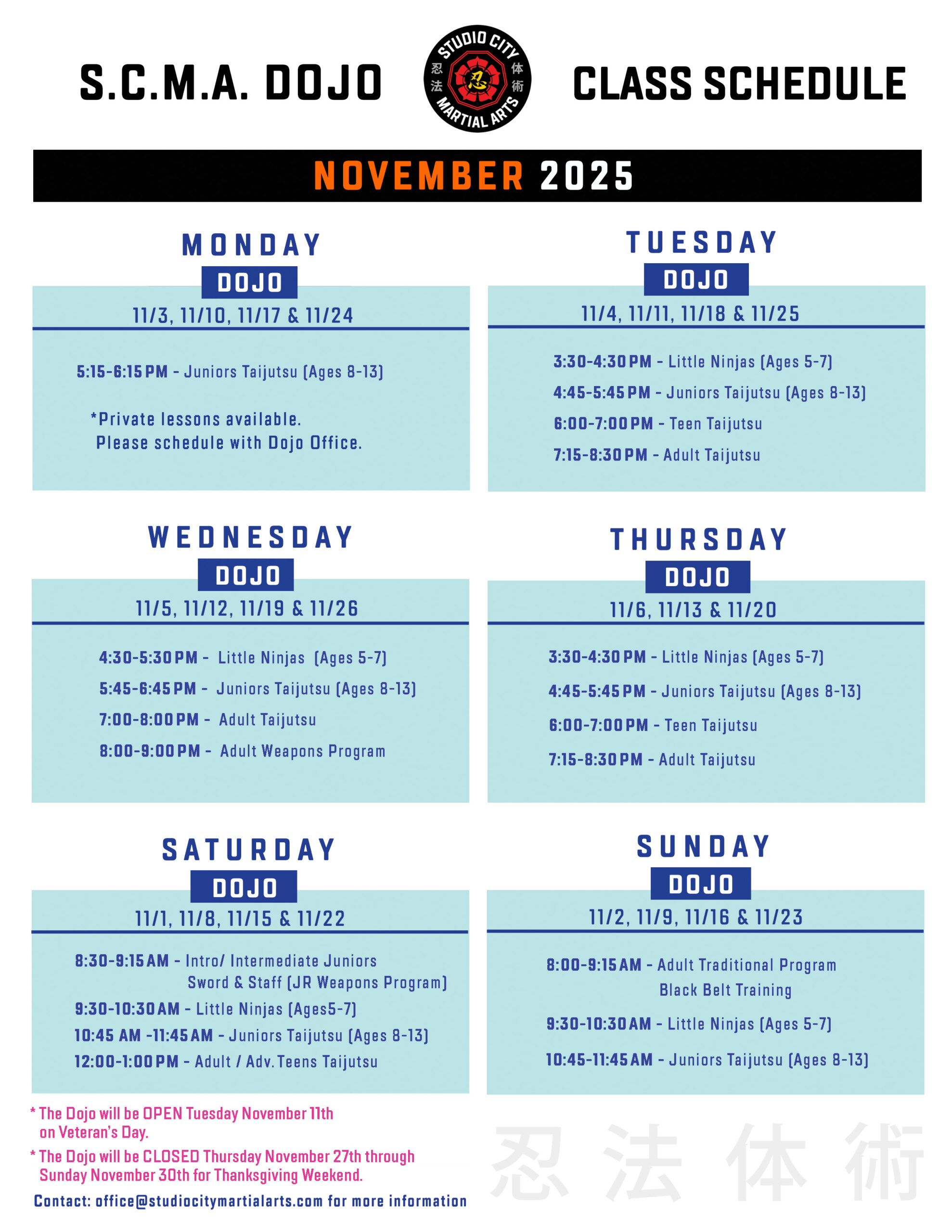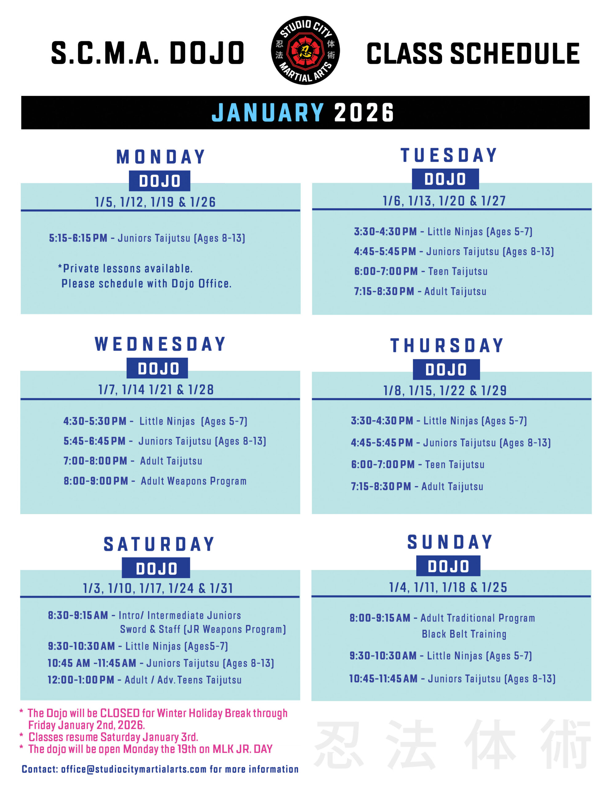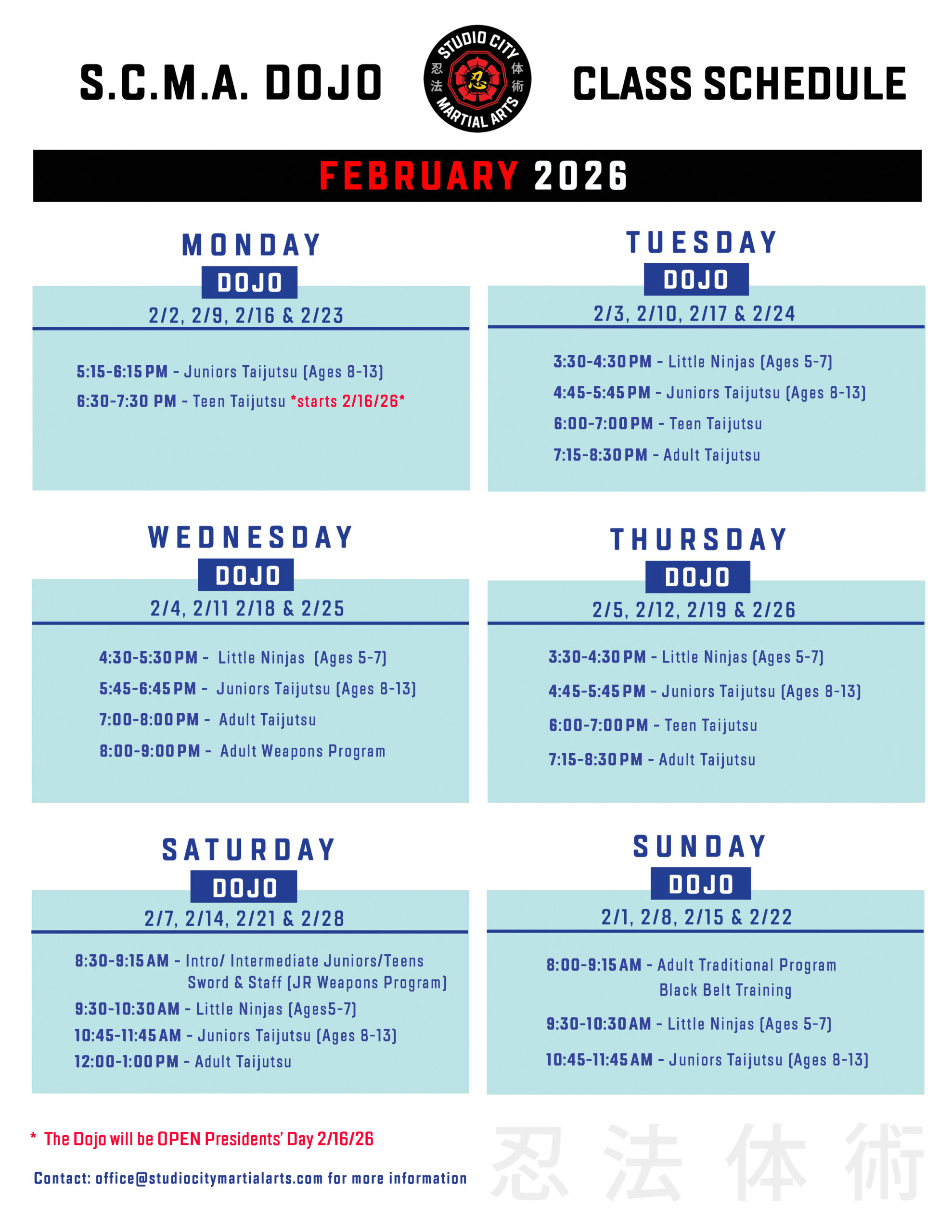 Email office@studiocitymartialarts.com for current class schedules and availability.